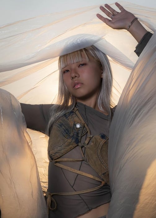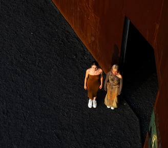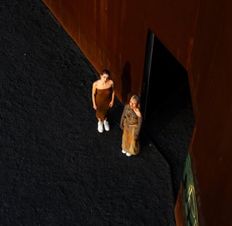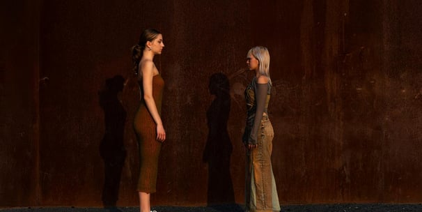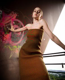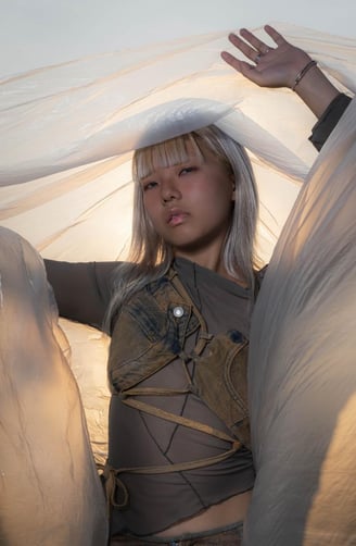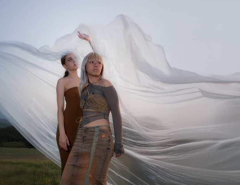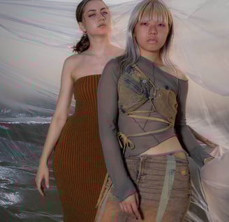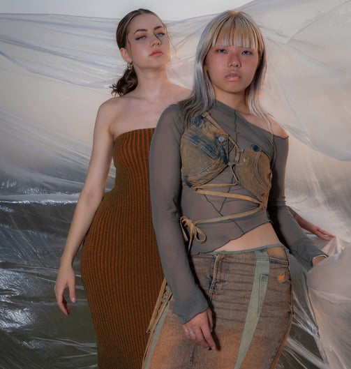 Complementary explores the art of recycling different materials into new garments, focusing on juxtaposing materials and colors. The collection juxtaposes rigid fabrics like denim with flowing, transparent textiles such as soft tulle and cozy wool knits. A key feature of the collection is the use of complementary colors, where contrasting pairs like orange and blue, as well as orange and green, are prominently featured. Complementary colors are positioned opposite each other on the color wheel, creating a striking visual contrast due to their differing wavelengths of light. This interplay enhances their visual opposition, emphasizing the collection's exploration of contrasting elements in fashion design.